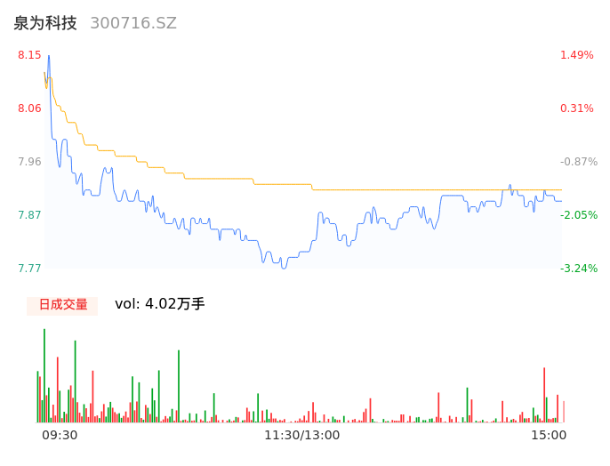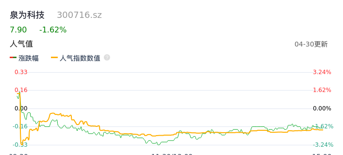04月30日,泉为科技收报7.90,股价涨幅-1.62%,成交金额3180.29万元,换手率2.51%。