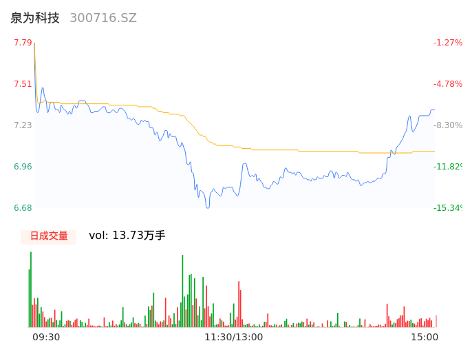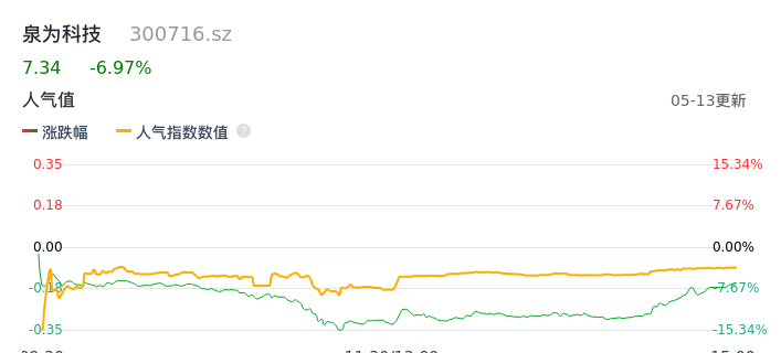 05月13日,泉为科技收报7.34,股价涨幅-6.97%,成交金额9700.90万元,换手率8.58%。