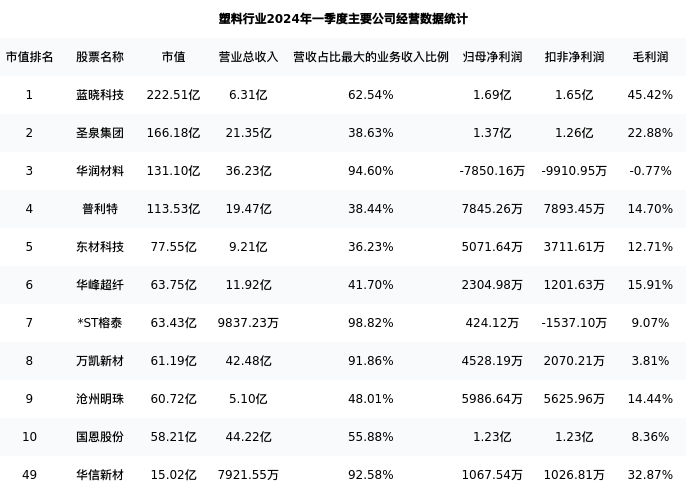 华信新材最新报告期数据为一季度,下表汇总了塑料行业内市值靠前的公司一季度主要经营数据