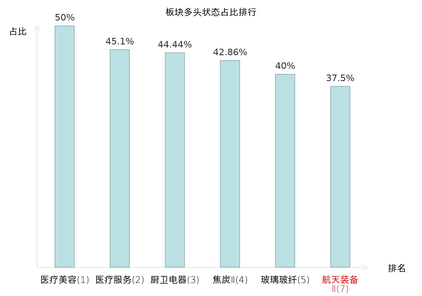 全市场所有行业板块中主力多头状态占比排名中,医疗美容板块位居第一。养殖业板块名次提升最快,较昨日上升90位。