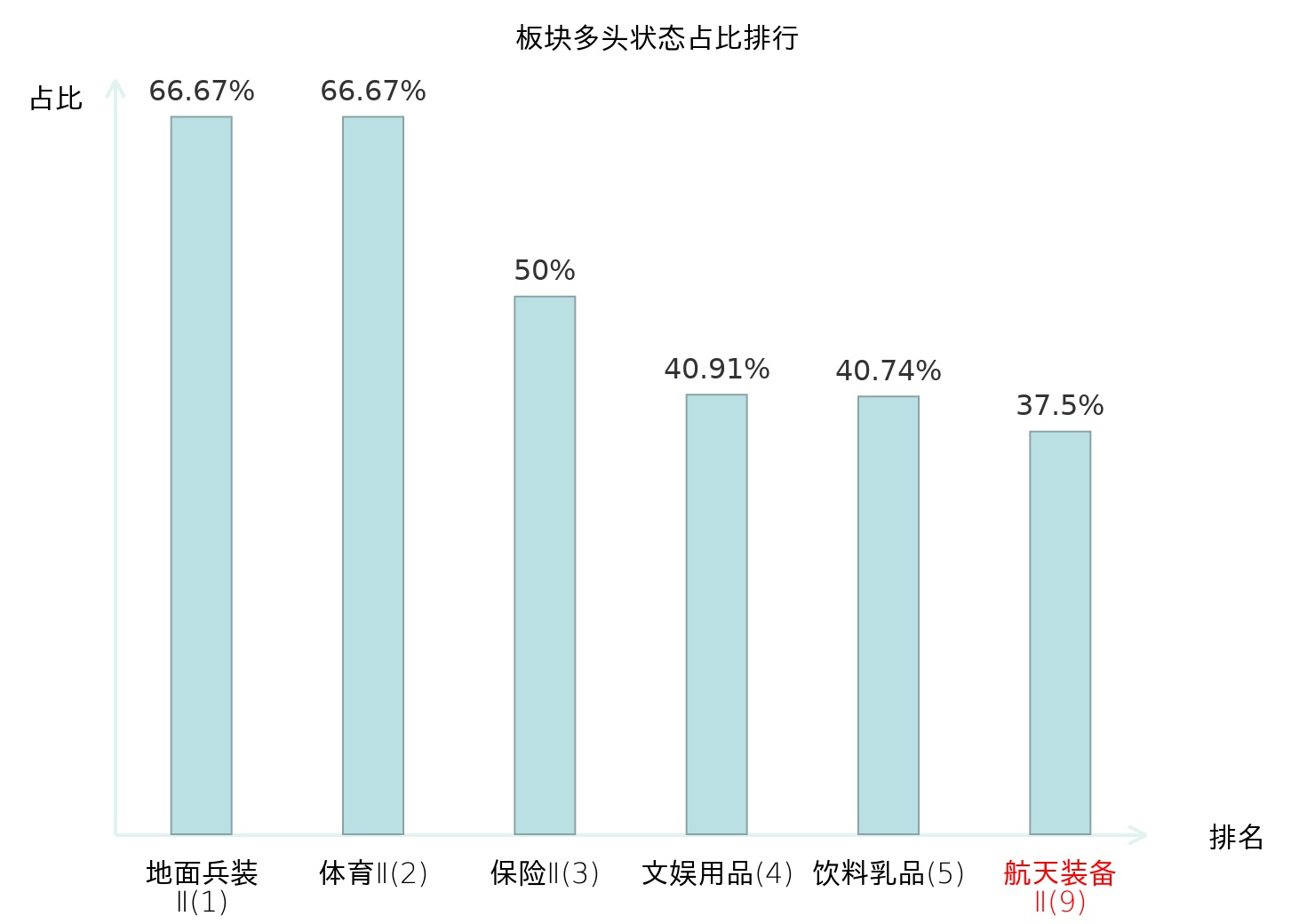 全市场所有行业板块中主力多头状态占比排名中,地面兵装Ⅱ板块位居第一。电视广播Ⅱ板块名次提升最快,较昨日上升82位。
