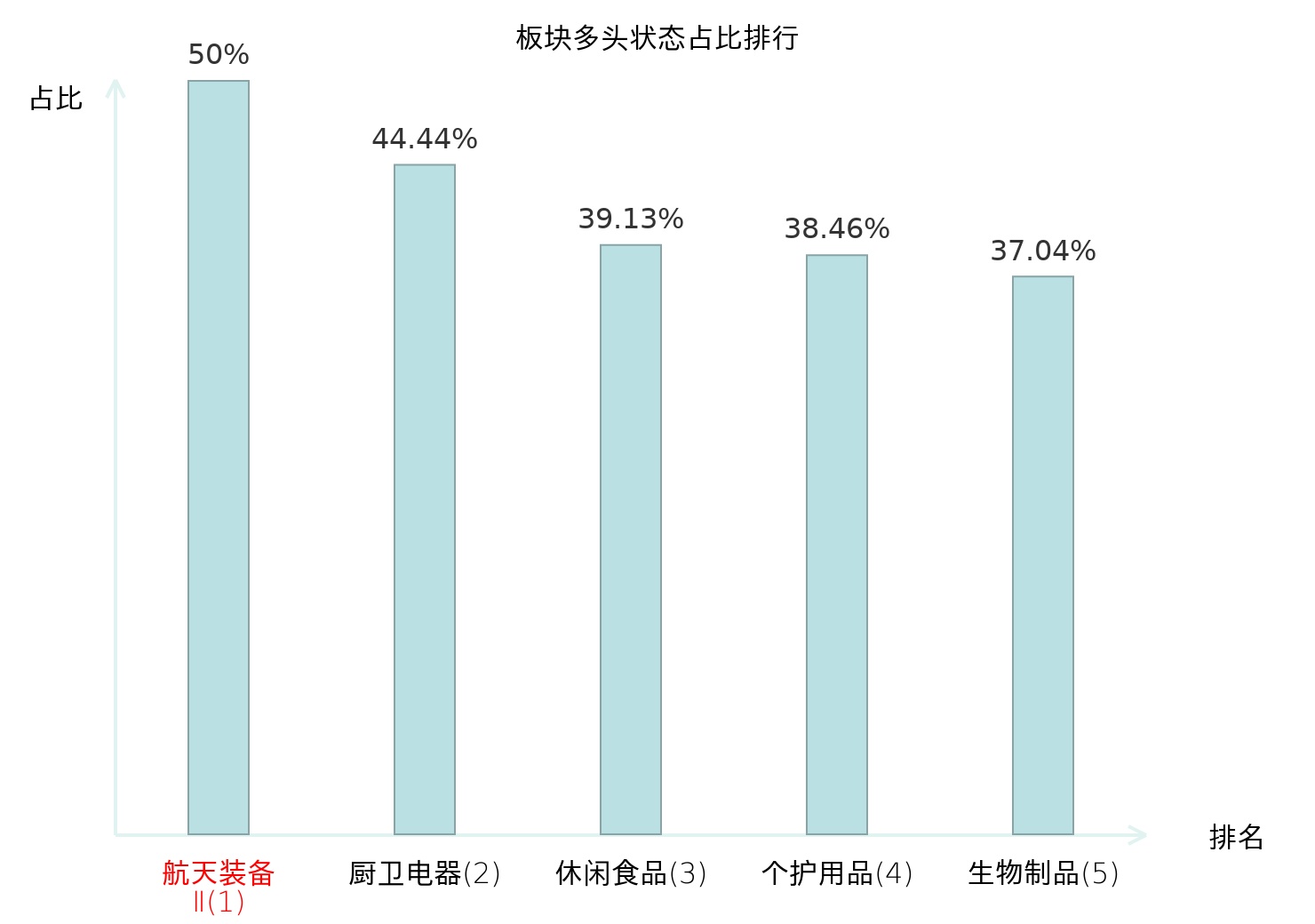 全市场所有行业板块中主力多头状态占比排名中,航天装备Ⅱ板块位居第一。小金属板块名次提升最快,较昨日上升53位。