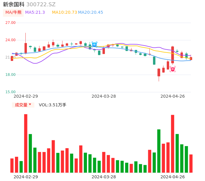 04月26日,新余国科收报21.01,股价涨幅0.72%,成交金额7426.42万元,换手率1.52%。