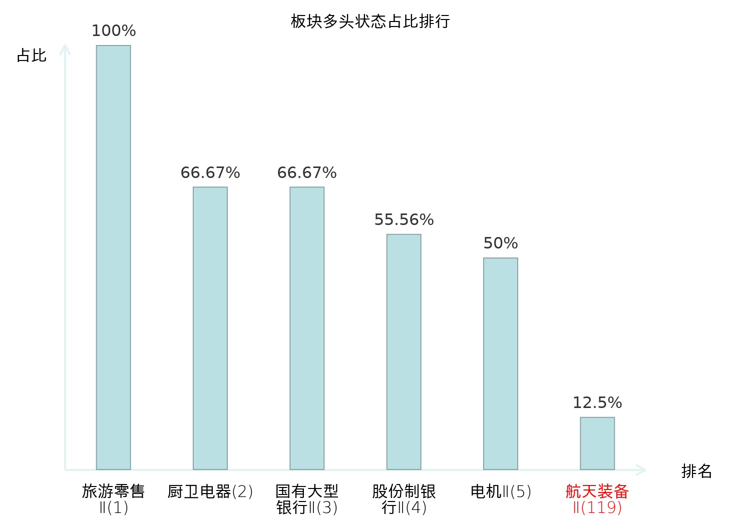 全市场所有行业板块中主力多头状态占比排名中,旅游零售Ⅱ板块位居第一。水泥板块名次提升最快,较昨日上升80位。