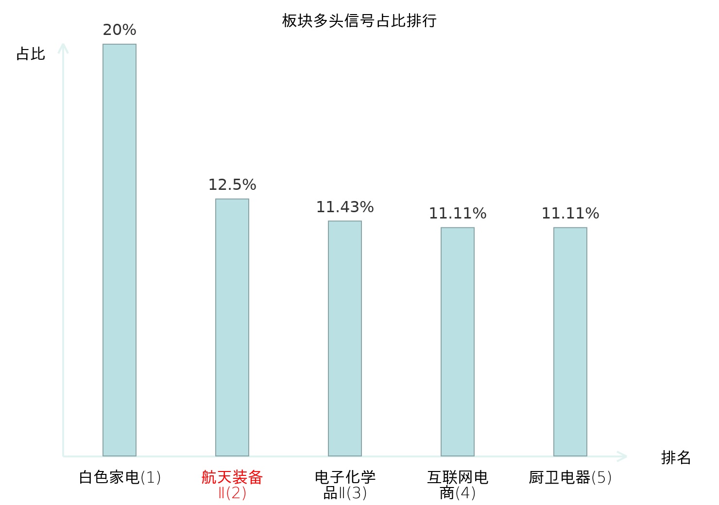 全市场所有行业板块中主力多头信号占比排名中,白色家电板块位居第一。航天装备Ⅱ板块名次提升最快,较昨日上升118位。