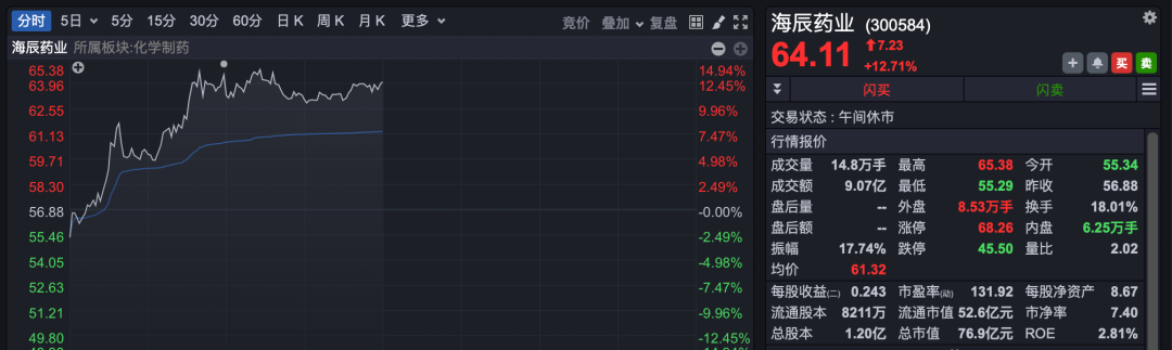 调整多日的医药生物概念股早间再度集体上攻,化学制药、创新药、仿制药、减肥药等细分板块集体放量大涨超2%,海辰药业、一品红、德展健康、健康元等涨停或涨超10%。
