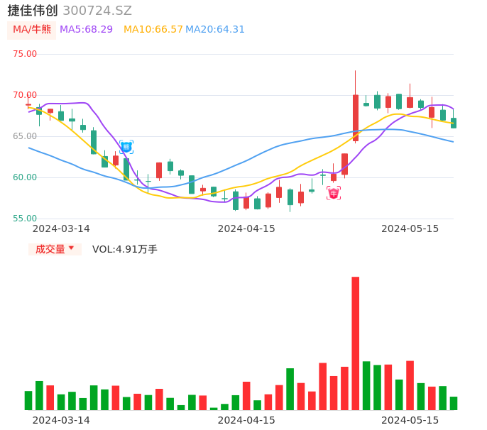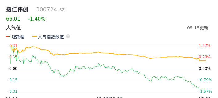 05月15日,捷佳伟创收报66.01,股价涨幅-1.40%,成交金额3.29亿元,换手率1.79%。