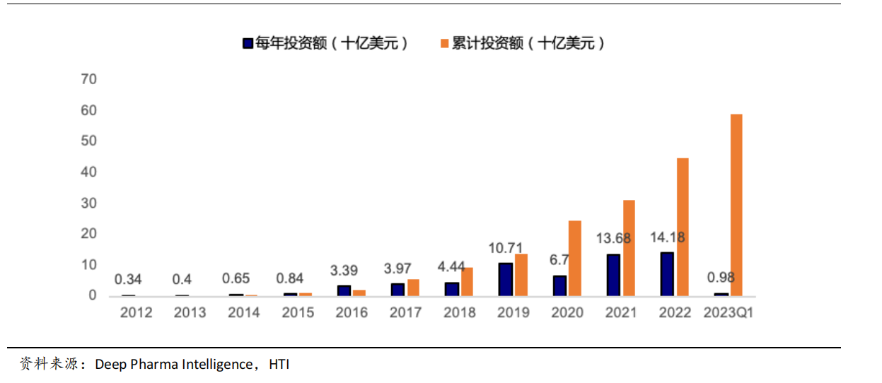 AI制药投融资市场活跃,根据DeepPharmaIntelligence官网数据,截止2023Q1累积投资额达602亿美元,市场规模持续增长!