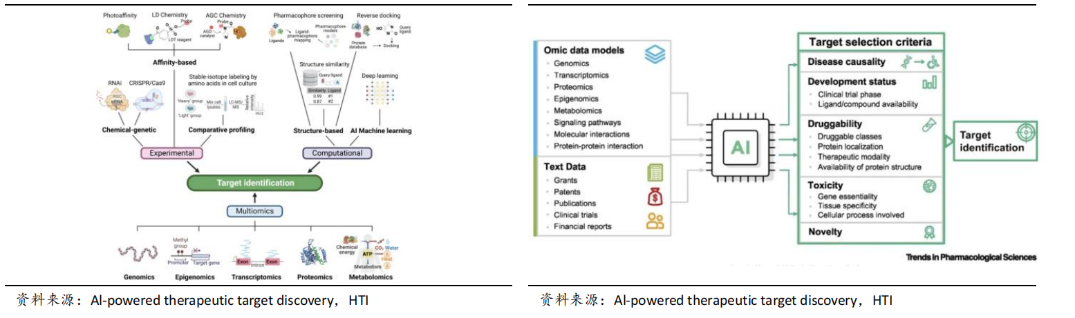 图表4:靶点识别的三种探索性策略(左)人工智能驱动的靶点发现的工作流(右)