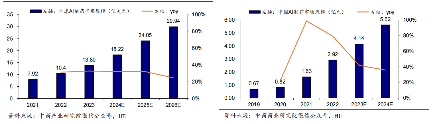 图表5:2021-2026年全球AI制药市场规模趋势预测图(左)2019-2024年中国AI制药市场规模趋势预测图(右)