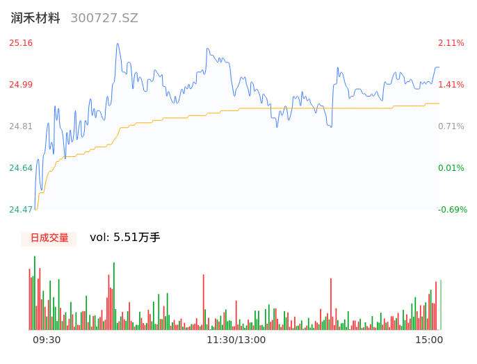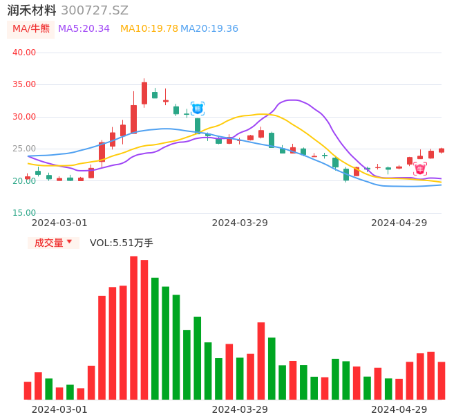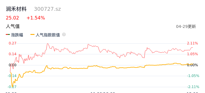 04月29日,润禾材料收报25.02,股价涨幅1.54%,成交金额1.37亿元,换手率4.83%。