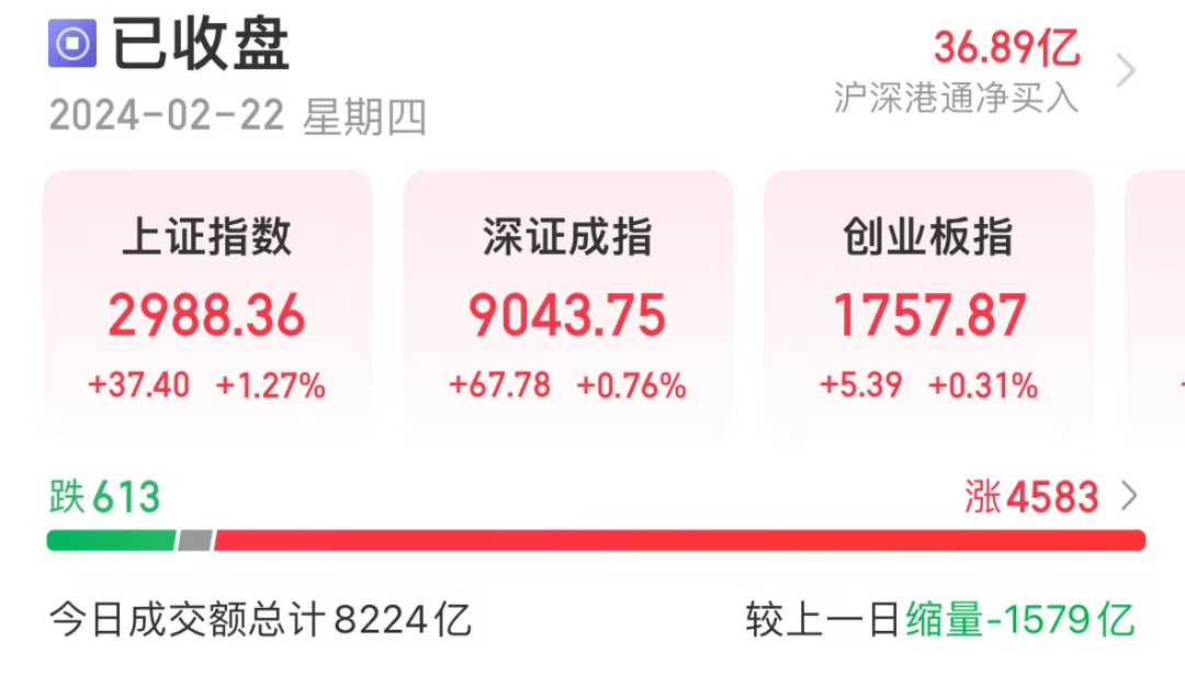 今日沪指上涨1.27%,收获7连阳,逼近3000点;创业板指走势稍弱,上涨0.31%。AI概念股集体走强,国资云方向领涨,算力概念股走高,煤炭、石油等高股息板块再受追捧,中国石油股价创9年来新高。银行、机场、白酒等板块涨幅较小。