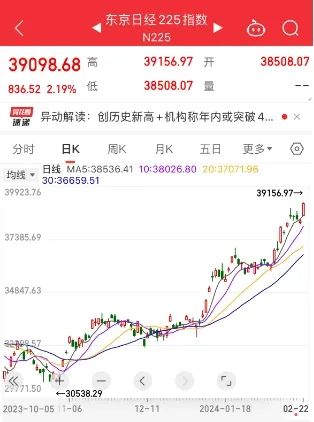 2023年以来日经225指数强劲反弹,已累计上涨近50%,成为全球基金的首选。今日日经225指数收盘涨2.19%,报39098.68点,收盘创历史新高,并且首次突破39000点关口,超过了泡沫经济期1989年12月29日创下的38957.44点。