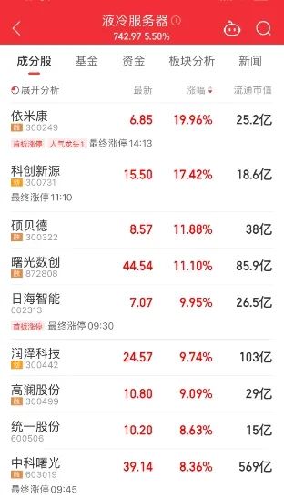液冷服务器板块今日高开高走,依米康20cm涨停,科创新源、曙光数创、英特科技等股涨超10%。