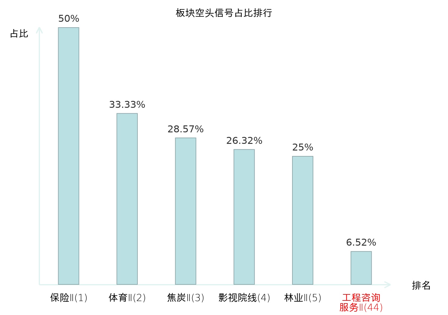 全市场所有行业板块中主力空头信号占比排名中,保险Ⅱ板块位居第一。装修建材板块名次提升最快,较昨日上升118位。