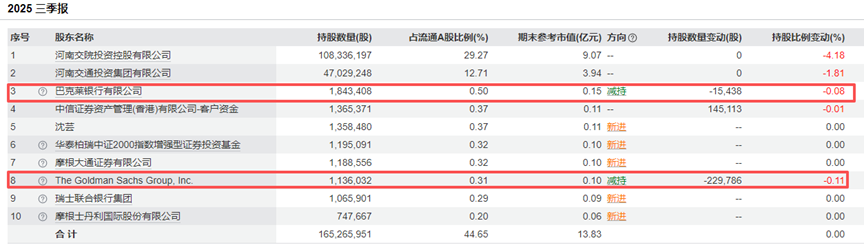 或受业绩等因素影响,根据2025年三季报的前十大流通股东来看,今年二季度新进成为公司前十大流通股东的2家QFII机构——巴克莱银行有限公司及The Goldman Sachs Group, Inc.,在三季度均环比减持公司股份。