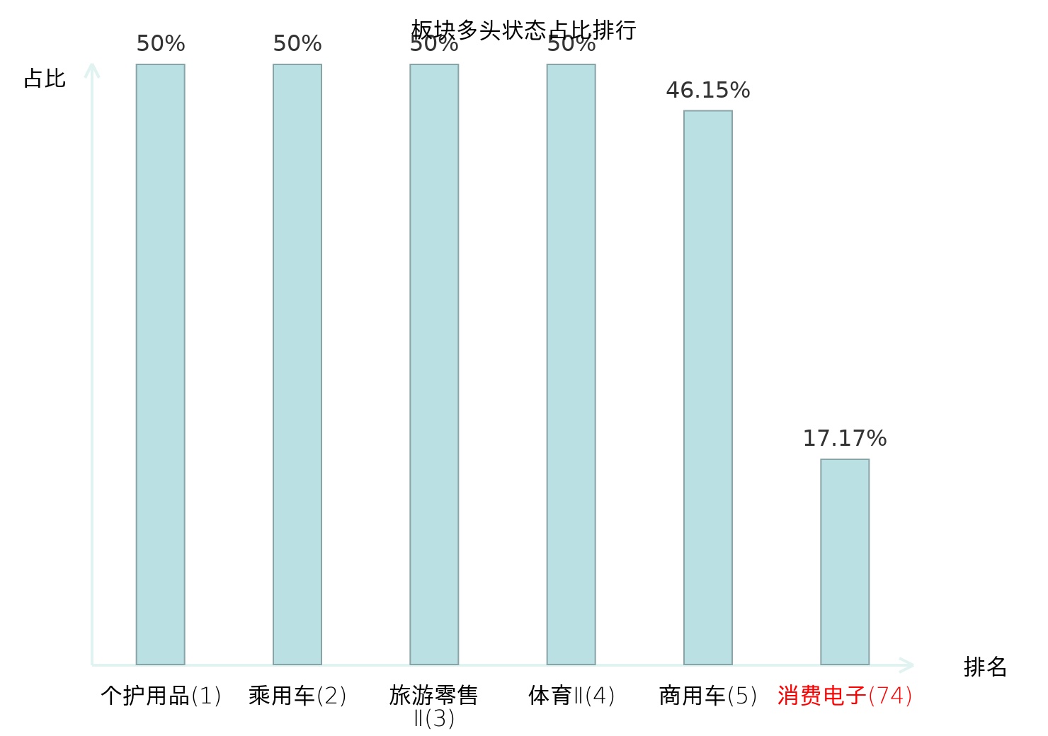全市场所有行业板块中主力多头状态占比排名中,个护用品板块位居第一。林业Ⅱ板块名次提升最快,较昨日上升94位。