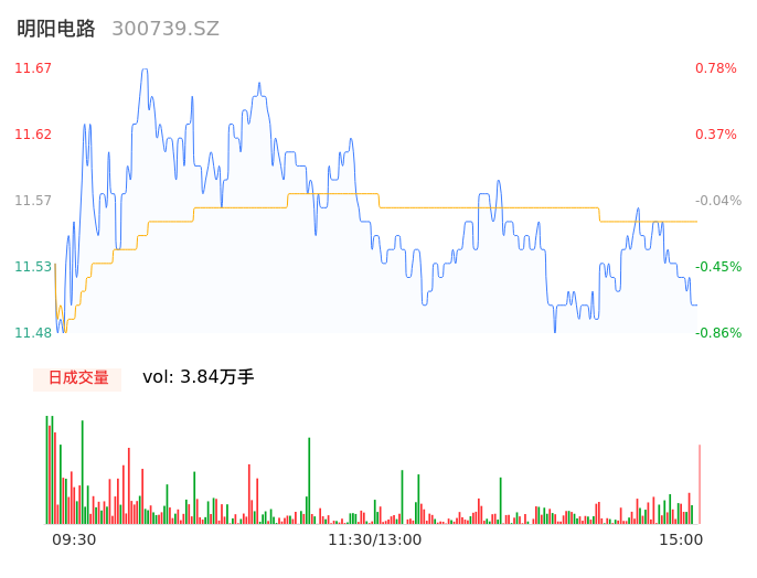 04月25日,明阳电路收报11.52,股价涨幅-0.52%,成交金额4434.30万元,换手率1.31%。
