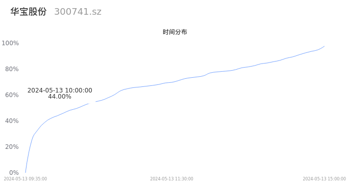 首先我们来看当日成交的时间分布。将今日交易时间按照5分钟的时间间隔进行切片,并绘制分布直方图进行观察。可以发现,10点之前的成交量占全天成交量的44.00%,这说明,该股票活跃时段换手火爆,资金热情高涨。