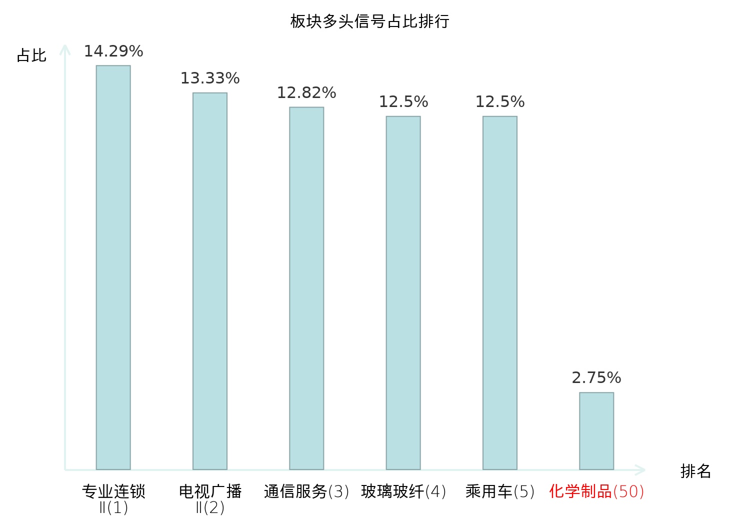 全市场所有行业板块中主力多头信号占比排名中,专业连锁Ⅱ板块位居第一。专业连锁Ⅱ板块名次提升最快,较昨日上升124位。