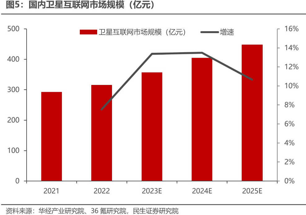 列星随旋,日月递炤。五年后,华为Mate60pro+已支持北斗天通双星通讯,海外SpaceX也推出了星链直连手机业务。海内外卫星互联网产业同样呈现快速发展态势,据研究,国内2021年卫星互联网市场规模为292亿元,2022年达到314亿元,到2025年有望达到447亿元。