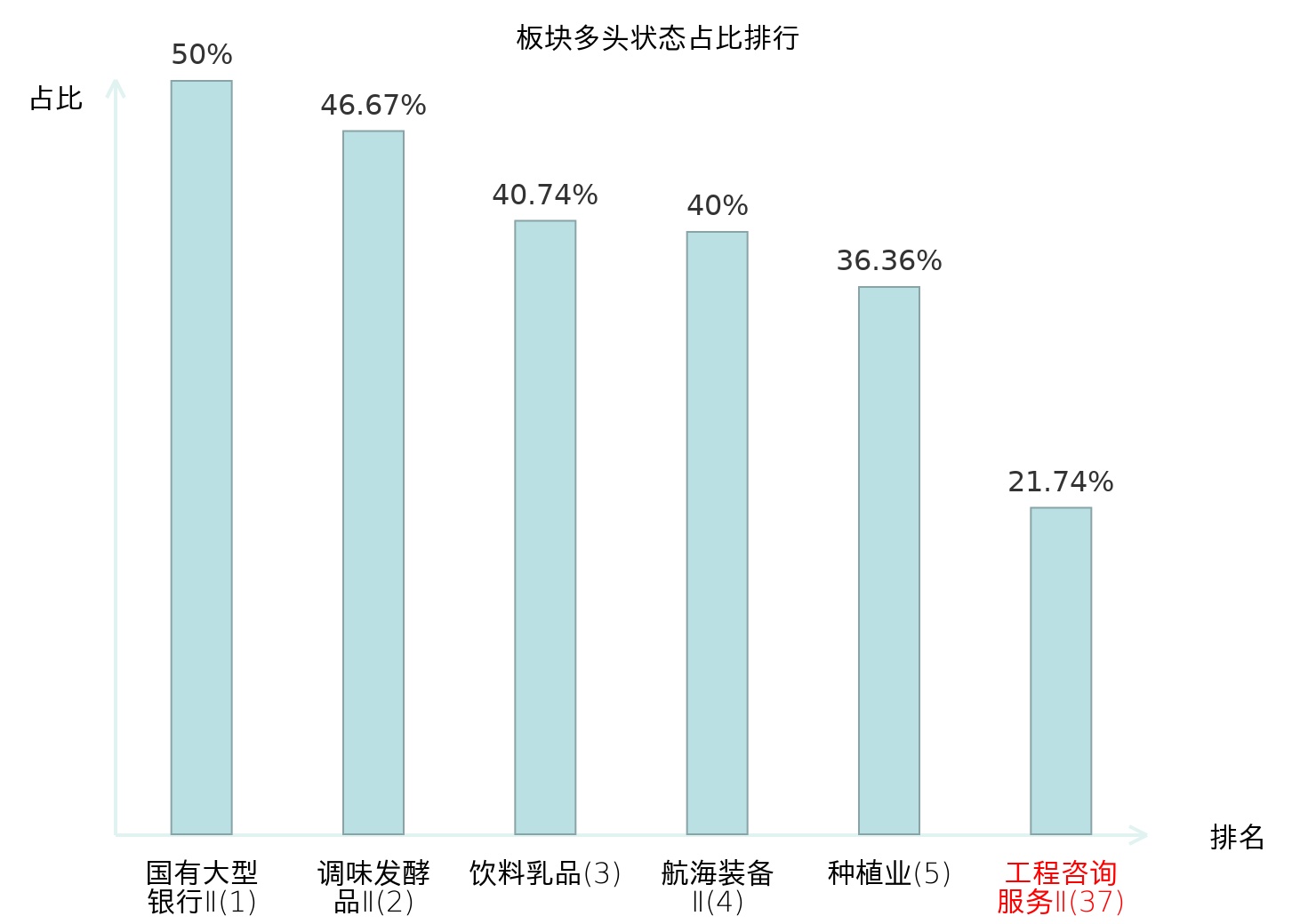 全市场所有行业板块中主力多头状态占比排名中,国有大型银行Ⅱ板块位居第一。金属新材料板块名次提升最快,较昨日上升71位。