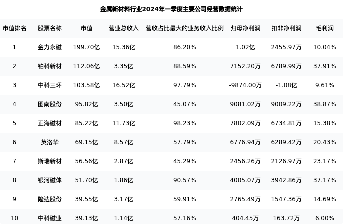 金力永磁最新报告期数据为一季度,下表汇总了金属新材料行业内市值靠前的公司一季度主要经营数据
