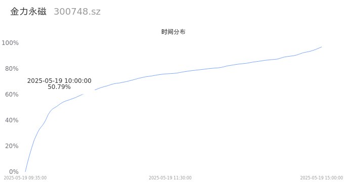 300748金力永磁2025年05月19日成交49.07万手,成交金额10.19亿,相较昨日缩量13.89万手,换手率4.33%,成交清淡。