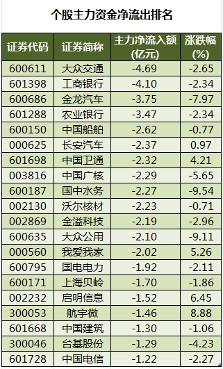 此外,2400只个股被主力资金净卖出,其中,27股被主力资金净卖出超1亿元。主力资金净流出最多的个股是大众交通,净流出金额为4.69亿元;主力资金净流出居前的个股还有工商银行、金龙汽车、农业银行、中国船舶、长安汽车,净流出金额分别为4.1亿元、3.75亿元、3.47亿元、2.62亿元、2.37亿元。