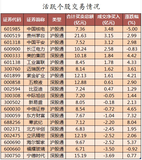 活跃个股方面,北向资金今日净买入较多的有中国核电、贵州茅台、中国平安、长江电力、美的集团,净买入金额分别为3.48亿元、3.15亿元、3.12亿元、2.58亿元、1.84亿元。北向资金净卖出较多的有宁德时代、福耀玻璃、海尔智家、立讯精密、北方华创,净卖出金额分别为3.69亿元、3.5亿元、2.52亿元、2.52亿元、2.45亿元。