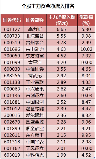 个股来看,今日有2674只个股获主力资金净流入,其中,69股获主力资金净流入超1亿元。赛力斯主力资金净流入最多,净流入金额为6.65亿元;主力资金净流入居前的个股还有北汽蓝谷、贵州茅台、宗申动力、东方财富、太平洋,净流入金额分别为5.55亿元、4.78亿元、4.63亿元、4.52亿元、4.2亿元。