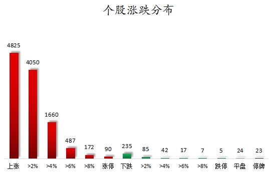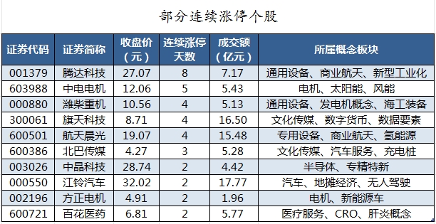 截至收盘,沪深两市合计4825只个股上涨,235只个股下跌,平盘个股24只,停牌的个股23只。不含当日上市新股,共有90只个股涨停,5只个股跌停。连续涨停天数看,腾达科技已连收8个涨停板,连续涨停板数量最多。
