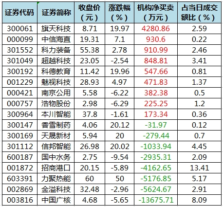 盘后龙虎榜数据显示,今日机构席位资金合计净卖出约2.41亿元。其中,净买入的个股9只,净卖出的个股8只。机构净买入最多的股票是旗天科技,净买入金额约4280.86万元;机构净买入的还有中信海直、科力装备、超越科技等股。机构净卖出最多的股票是中国广核,净卖出金额约1.37亿元;机构净卖出居前的还有金溢科技、力聚热能等股。