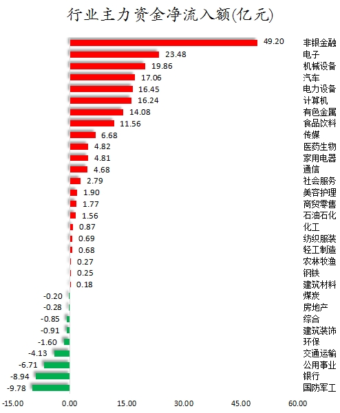 从行业来看,申万所属的31个一级行业,今日有22个行业主力资金呈现净流入,其中,非银金融行业主力资金净流入最多,净流入金额为49.2亿元;行业主力资金净流入居前的还有电子、机械设备、汽车、电力设备、计算机,净流入金额分别为23.48亿元、19.86亿元、17.06亿元、16.45亿元、16.24亿元。9个行业主力资金呈现净流出,其中,国防军工行业主力资金净流出最多,净流出金额为9.78亿元;行业主力资金净流出靠前的还有银行、公用事业,净流出金额分别为8.94亿元、6.71亿元。
