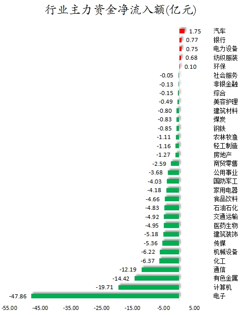 从行业来看,申万所属的31个一级行业,今日有5个行业主力资金呈现净流入,其中,汽车行业主力资金净流入最多,净流入金额为1.75亿元;行业主力资金净流入居前的还有银行、电力设备,净流入金额分别为0.77亿元、0.75亿元。26个行业主力资金呈现净流出,其中,电子行业主力资金净流出最多,净流出金额为47.86亿元;行业主力资金净流出靠前的还有计算机、有色金属、通信、化工、机械设备,净流出金额分别为19.71亿元、14.42亿元、12.19亿元、6.37亿元、6.22亿元。