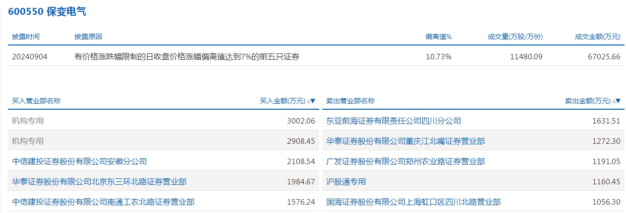 保变电气今天涨停。盘后数据显示,2家机构出现在龙虎榜单上,合计净买入5910.51万元;中信建投证券股份有限公司安徽分公司买入2108.54万元;华泰证券股份有限公司北京东三环北路证券营业部买入1984.67万元;沪股通专用席位卖出1160.45万元。
