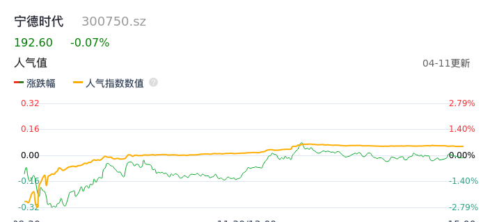 04月11日,宁德时代收报192.60,股价涨幅-0.07%,成交金额36.82亿元,换手率0.50%。