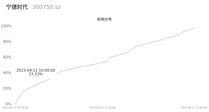 300750宁德时代2023年09月11日成交17.06万手,成交金额37.75亿元,相较昨日放量5615手,换手率0.44%,成交清淡。