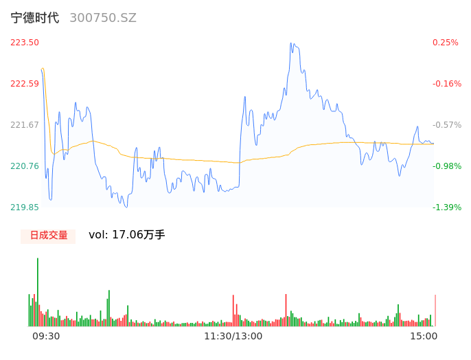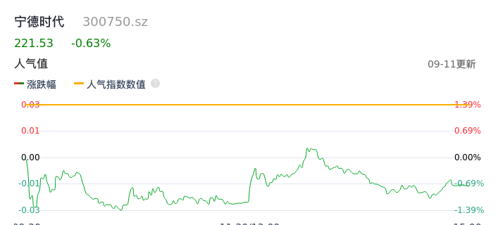 09月11日,宁德时代收报221.53,股价涨幅-0.63%,成交金额37.75亿元,换手率0.44%。