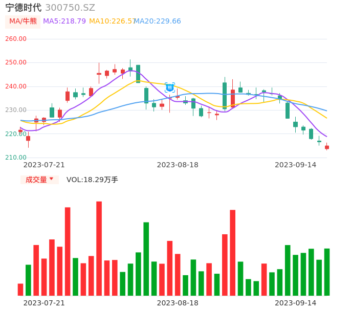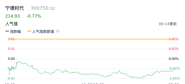 09月14日,宁德时代收报214.93,股价涨幅-0.77%,成交金额39.19亿元,换手率0.47%。