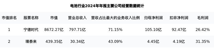 宁德时代最新报告期数据为年报,下表汇总了电池行业内市值靠前的公司年报主要经营数据