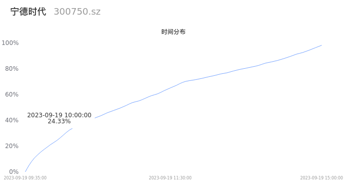 300750宁德时代2023年09月19日成交15.02万手,成交金额31.84亿元,相较昨日缩量11.57万手,换手率0.39%,成交清淡。