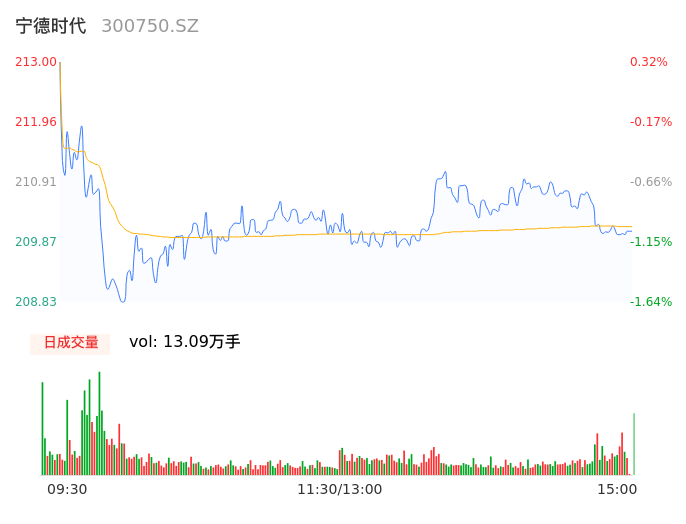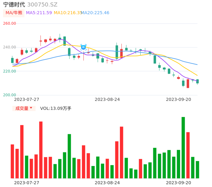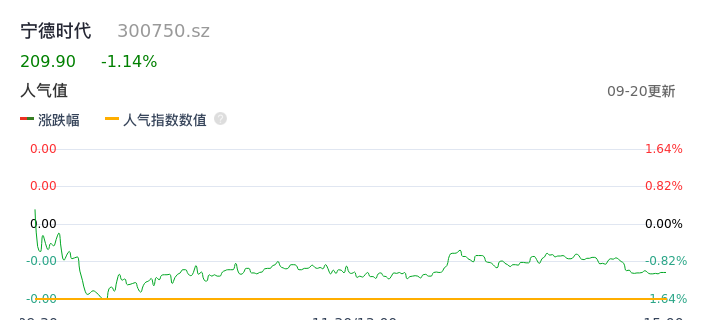 09月20日,宁德时代收报209.90,股价涨幅-1.14%,成交金额27.50亿元,换手率0.34%。
