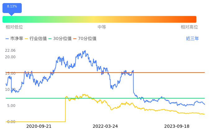 宁德时代当前市净率PB为5.50,在所属的电池中,市净率PB排84,前五名分别为骆驼股份市净率1.08、道氏技术市净率1.15、万润新能市净率1.20、帕瓦股份市净率1.23、嘉元科技市净率1.28。宁德时代当前市净率PB为5.50,超过近3年8.13%的历史数据。