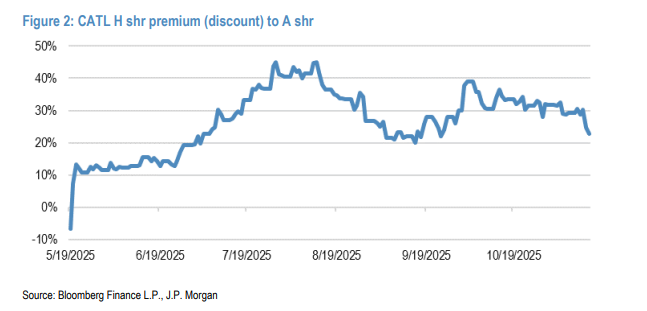 综合多空因素,摩根大通对宁德时代H股维持“中性”评级,但将目标价从600港元下调至575港元。其核心逻辑在于,预计IPO解禁后,H股对A股的异常高溢价将趋于收窄。