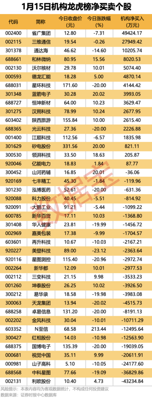 今日龙虎榜中,净买入个股有16只,净卖出的个股为25只。13股净买入金额均超千万元,省广集团获机构净买入4.94元,居首;其次是三维通信,机构净买入金额为2.79亿元。