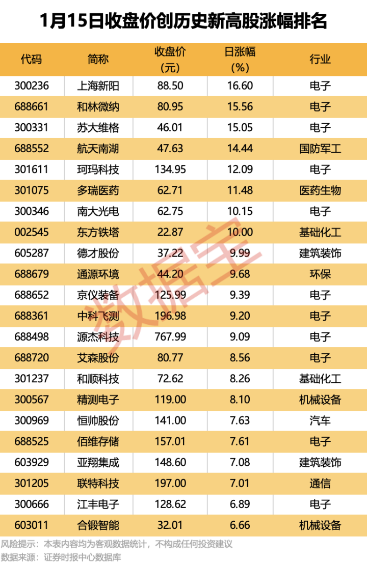 据证券时报·数据宝统计,不含近一年上市的次新股,今日共有88股收盘价创历史新高。从行业属性来看,电子、有色金属、机械设备行业创新高的个股较为集中,分别有25股、15股、14股出现在名单中。