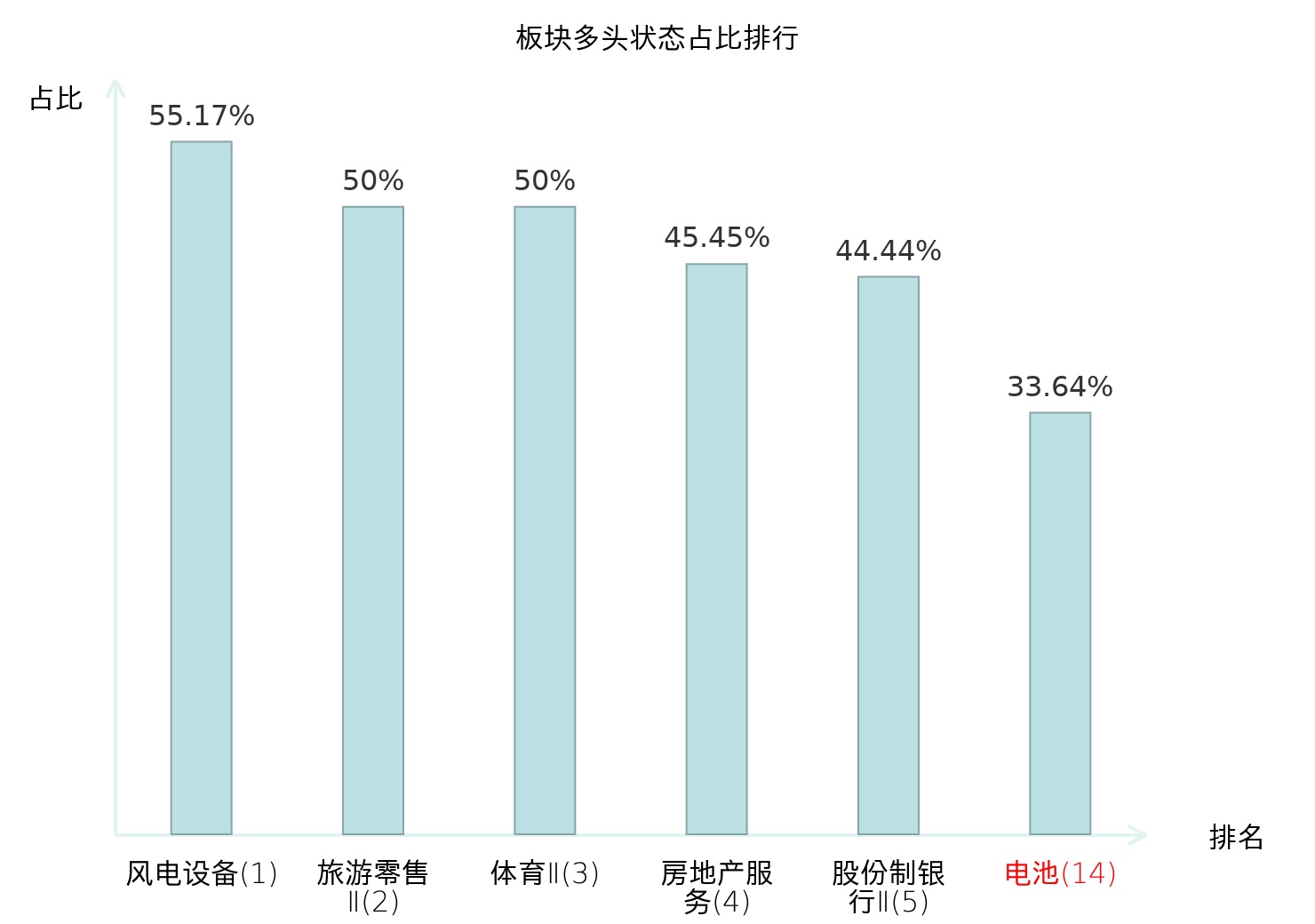 全市场所有行业板块中主力多头状态占比排名中,风电设备板块位居第一。保险Ⅱ板块名次提升最快,较昨日上升64位。