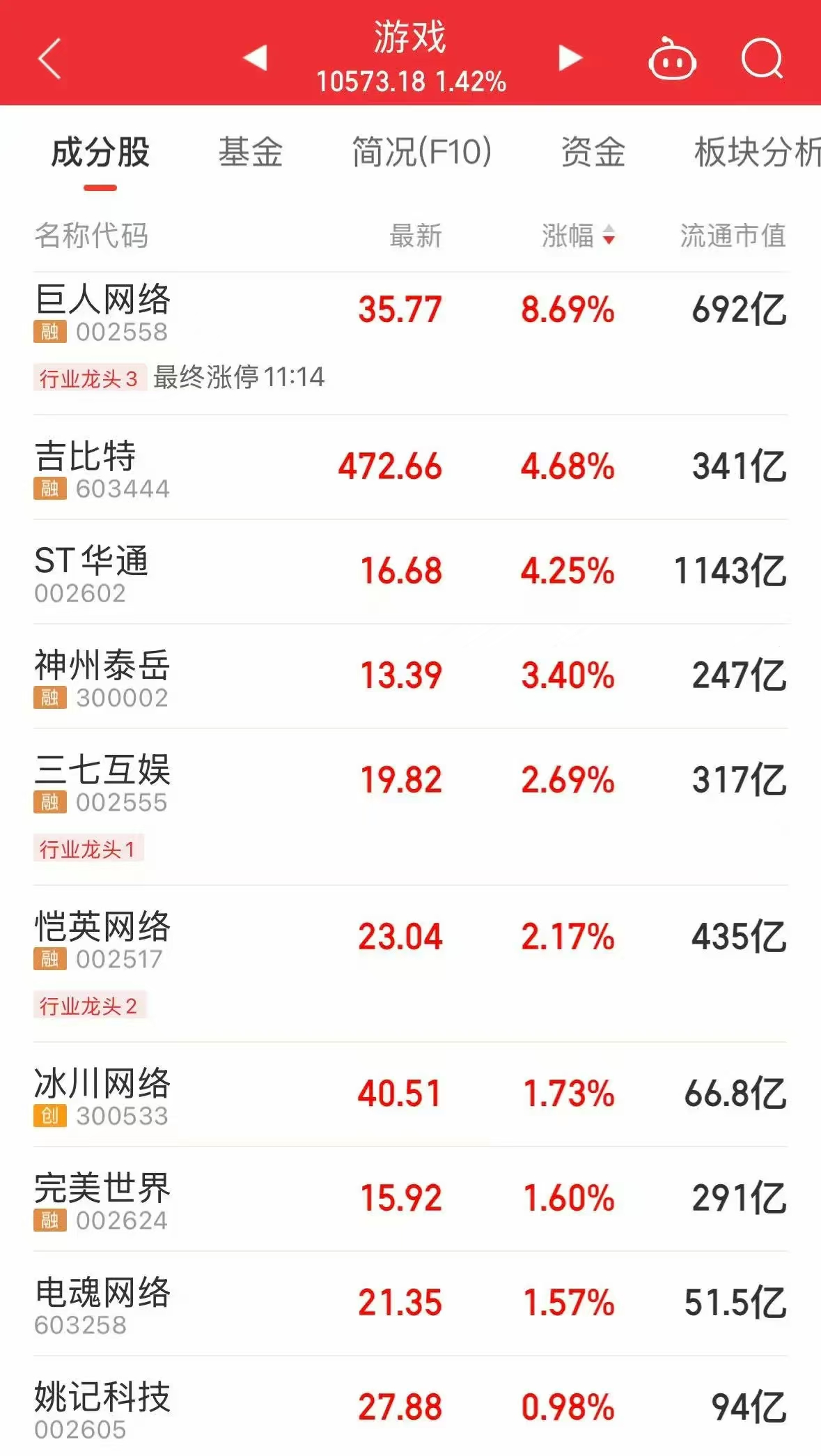 今天上午,文化传媒板块表现活跃,游戏板块领涨,巨人网络、神州泰岳等个股涨幅居前。影视院线等板块上涨。