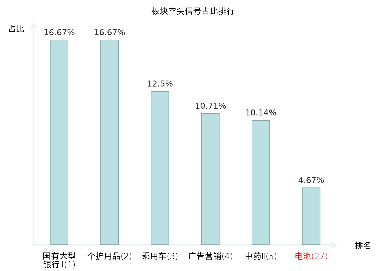 全市场所有行业板块中主力空头信号占比排名中,国有大型银行Ⅱ板块位居第一。医疗服务板块名次提升最快,较昨日上升110位。